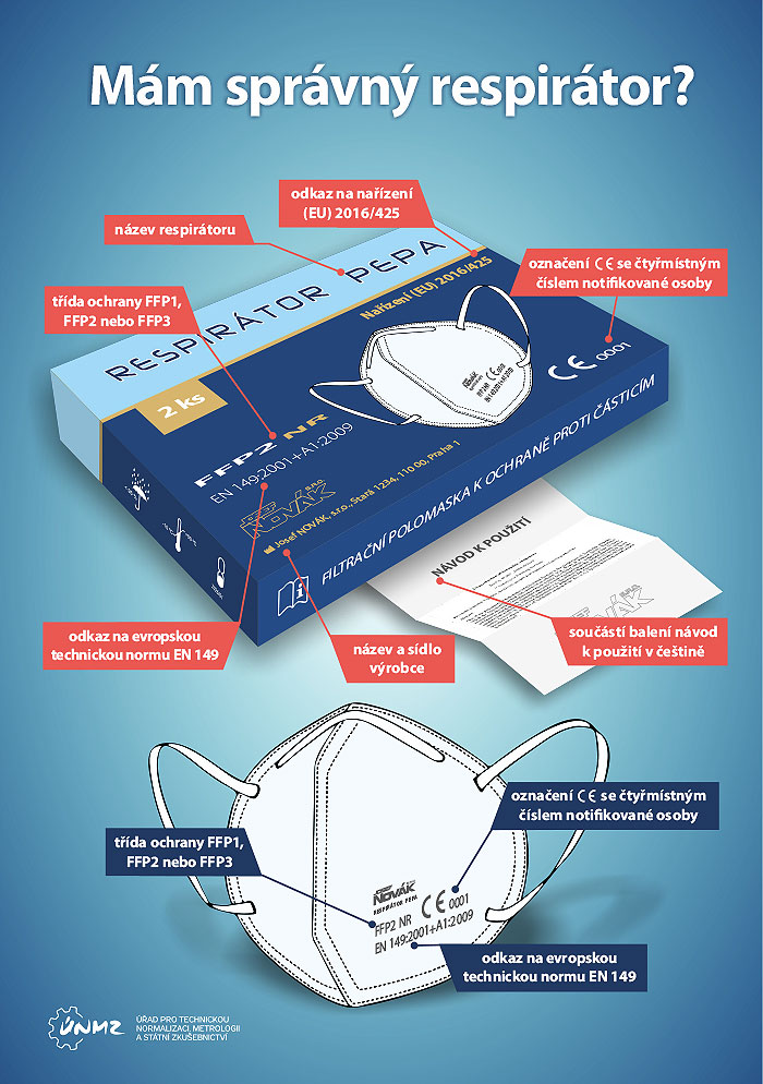 Jednoduchý informační leták s návodem, jak si vybrat správný respirátor, připravil pro spotřebitele Úřad pro technickou normalizaci, metrologii a státní zkušebnictví .